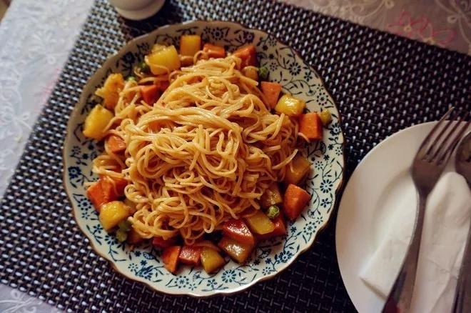 土豆,面条,青豆, 胡萝卜,油,盐,酱油